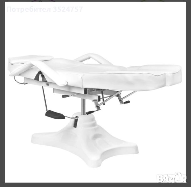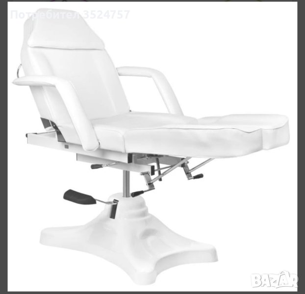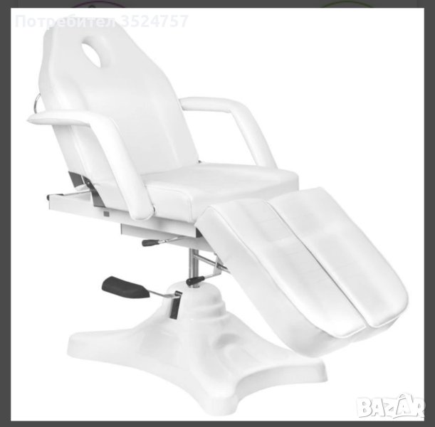 СТОЛ БЕЗ ЗАБЕЛЕЖКИ! Въртящ се стол с блокиране на въртенето, с раздвоена поставка за крака, с хидравлично повдигане и спускане, с отвор в облегалката за глава, идеален за козметика, педикюр, визаж и масаж. Разполага с подвижни подлакътници и възглавница за облегалката. Столът се мие лесно, изработен е от еко кожа, отговаряща на строгите изисквания на ЕС,с красиви, никелирани метални елементи. Креслото се предлага в бяло и се състои от: