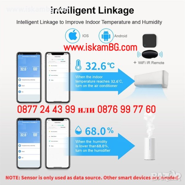 Когато температурата или влажността на околната среда се промени, можете да направите интелигентно свързване. Например, климатикът ще се включи при 20 °C и ще работи до 25 °, овлажнителят ще пръска, когато влажността е по-ниска от 20% RH и други.