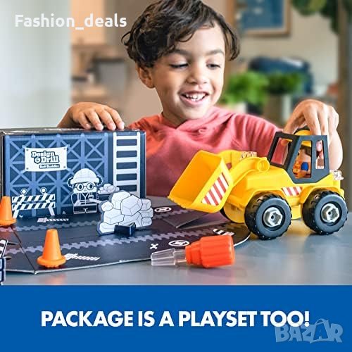Разглобяемата играчка позволява на децата да използват масивна отвертка и болтове, за да сглобят свой собствен булдозер с подвижна кофа с черпак.