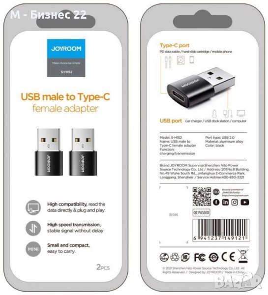 Компактен Joyroom S-H152 Type-C към USB адаптер с малък размер, който е направен от висококачествени компоненти и е оборудвано със система за защита срещу прегряване.