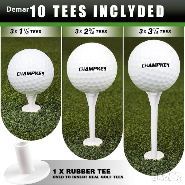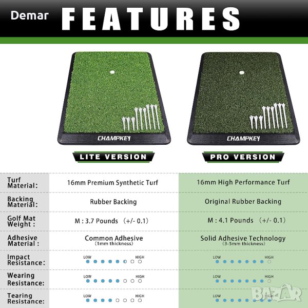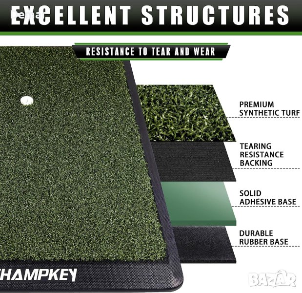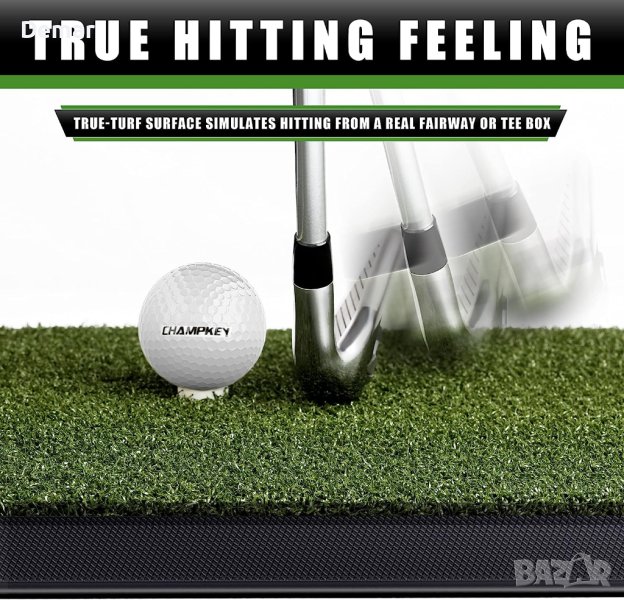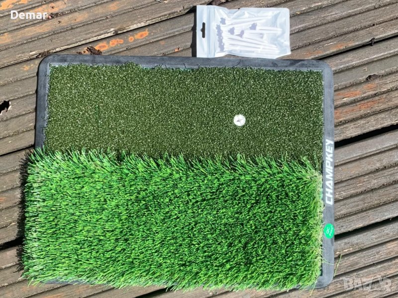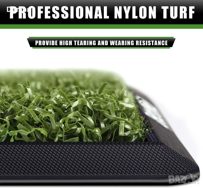 Пакетът включва постелка за голф, гумен тениска и различни размери пластмасови тениски. Първокласната синтетична тревна настилка с 16 мм истинска тревна повърхност осигурява реалистично изживяване на фарватера или тий бокса. Изключително издръжливата гумена подложка предлага отлична абсорбция на удари и не се плъзга, няма миризма и е устойчива на износване. Можете да се насладите на истинско усещане за трева и да тренирате ефективно с тази синтетична трева.