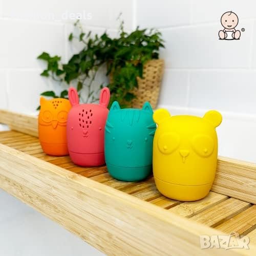 Комплектът включва четири цветни и ярки водни пръскалки с животински герои, които осигуряват забавление по време на къпане.