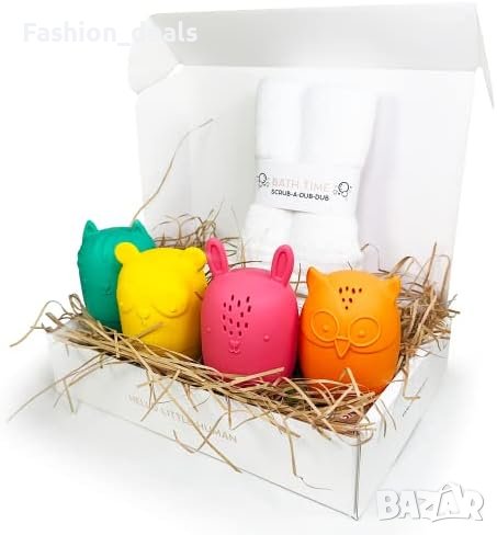 Безопасен и забавен комплект играчки за баня за бебета, който е идеален луксозен подарък за бебешки душове, кръщенета, специални поводи и рождени дни.