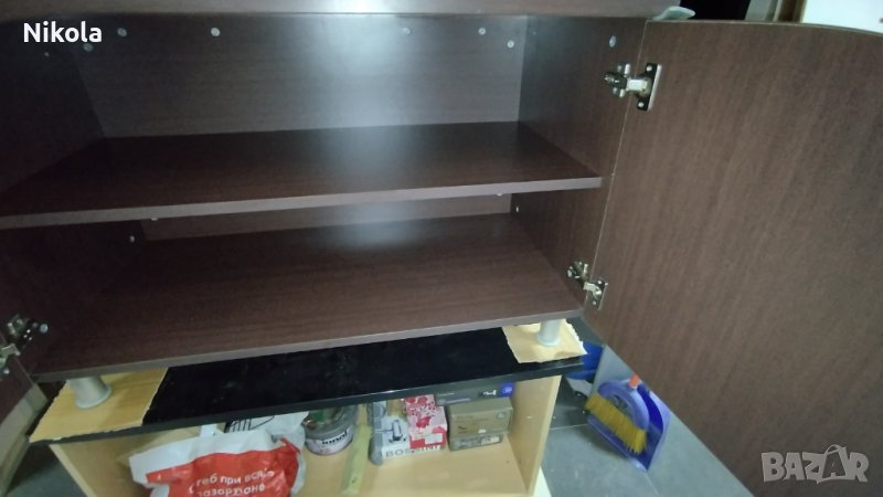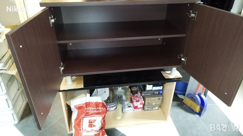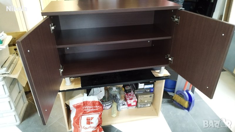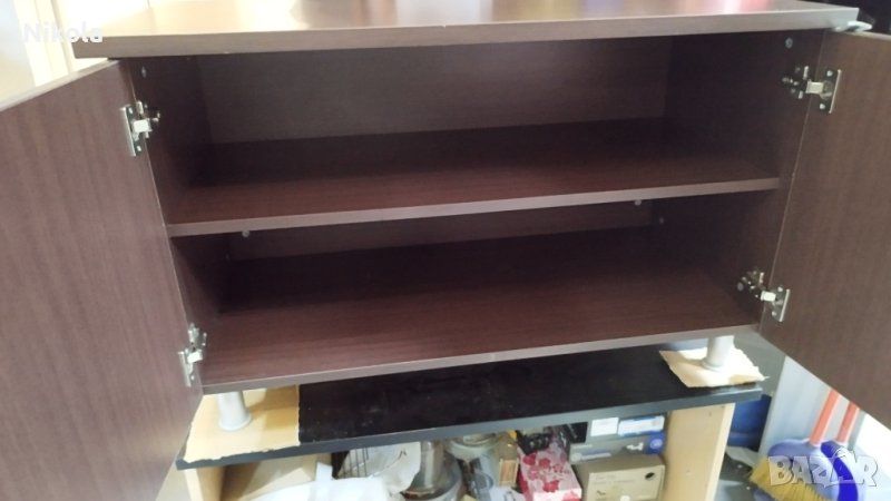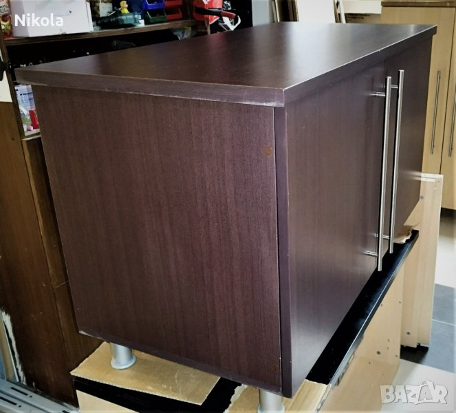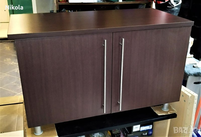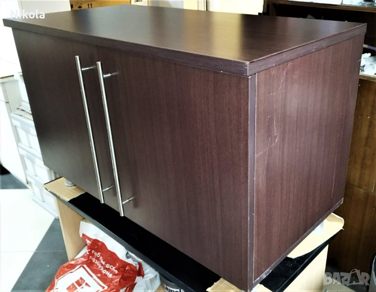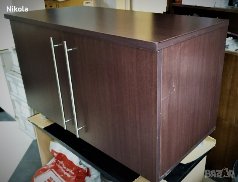 Продавам офисшкаф цвят палисандър - орех (кафеникав с дървесна шарка) с две врати и рафт, размерите са ширина103см / дълбочина 50см/ височина 65см. Шкафа е здрав с минимални следи от употреба като дребни драскотини. Плота е с дебелина 2,5см както за корпуса е 1,8см и рафтовета. Шкафа е със здрави кантове и панти и големи метални тръжки.