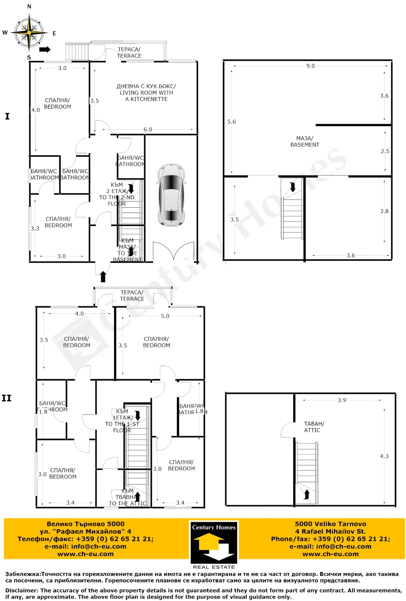 Имотът е с площ 300 кв.м., разпределенa между два етажа. Първия етаж се състои от слънчева дневна с кухненска част и тераса към нея, две спални със собствени бани/WC и още една отделна баня/WC, както и вход към просторна маза. Вътрешно стълбище води до вторият етаж, който включва: три спални, две от които с една обща тераса, една стая, която може да се обособи като дневна с кухненска част и две бани/WC. Вътрешно стълбище от втория етаж води до таванско помещение, което е подходящо за килер. Голям приземен етаж, с баня/WC, мокро помещение и голяма стая подходяща за дневна или фитнес стая.