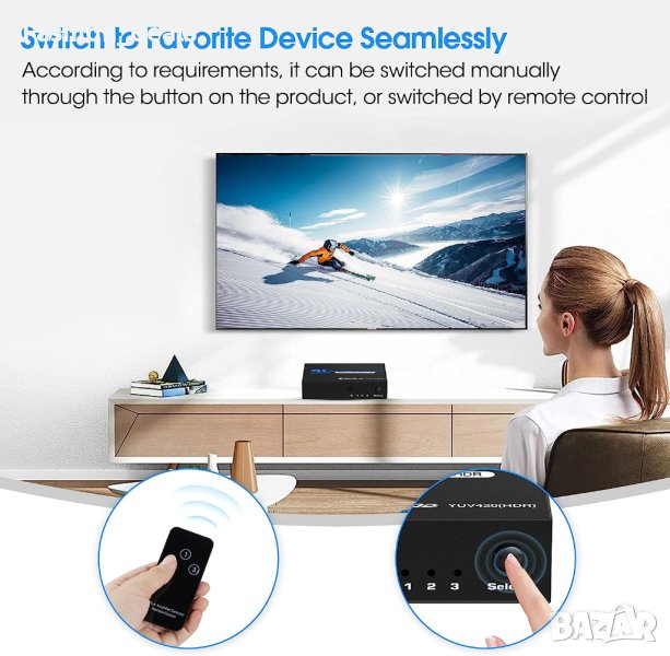 Поддържа широк набор от HDMI устройства, като например персонални компютри, лаптопи, игрови конзоли (Xbox, PlayStation), устройства за стрийминг (Fire Stick), Blu-ray плейъри и др.