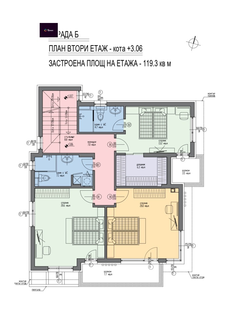 На втория етаж са разположени три спални, едната от които с дрешник и прилежаща баня с тоалет, още една баня с тоалет, килер и перално помещение, като от родителската спалня и едната детска стая се излиза на тераси. Третият етаж представлява едно просторно помещение с кухенски бокс, което може да се използва като втора всекидневна, зала за игри и забавления, кино салон, самостоятелно студио и др., килер, тоалет и панорамна тераса.