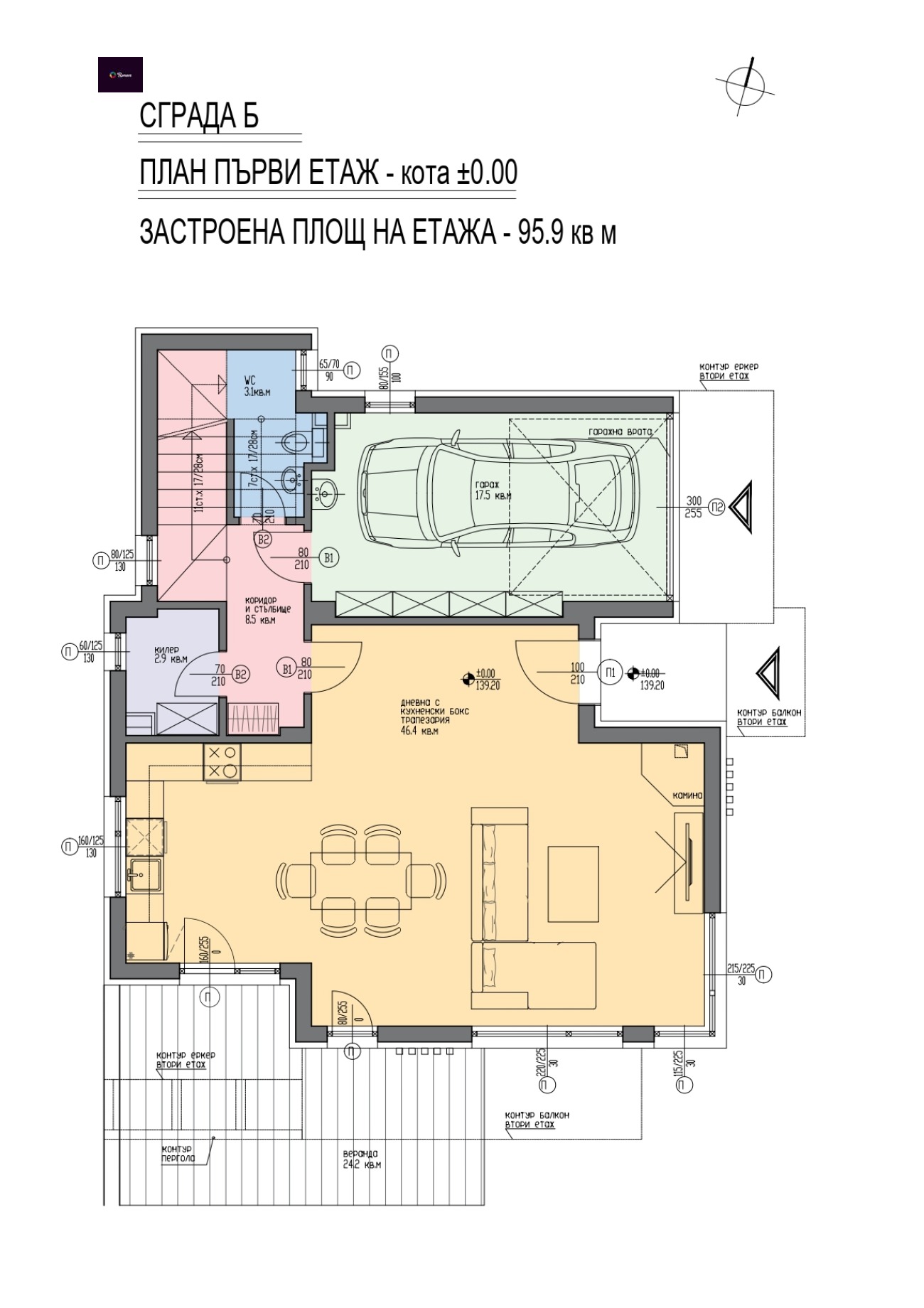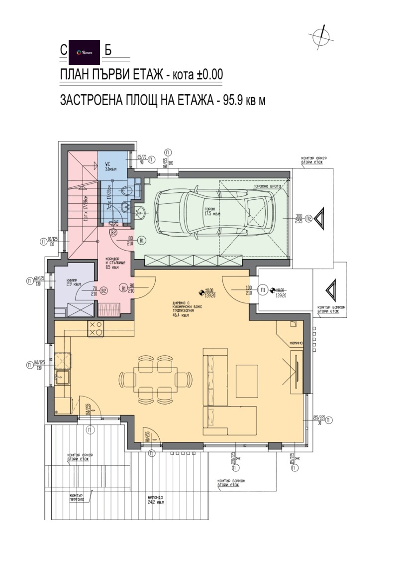 Къщата се състои от три етажа като на първия етаж са разположени входно антре, просторна всекидневна с кухненска част, тоалет, гараж и слънчева веранда.