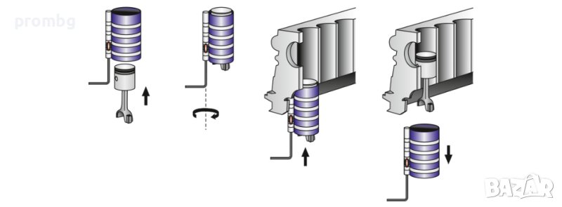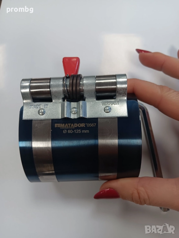 скоба за монтиране на бутала, MATADOR, внос от Германия. Поставя се върху буталото с вече монтирани сегменти. Натяга се посредством лимбусен ключ/ в комплекта/, така че сегментите да се приберат максимално в каналите. След това скобата и буталото се нанизват в блока. Освобождава се и се изтегля навън, а буталото остава монтирано. Височина на скобата 80 мм, диаметър на бутала от 60 мм до 125 мм