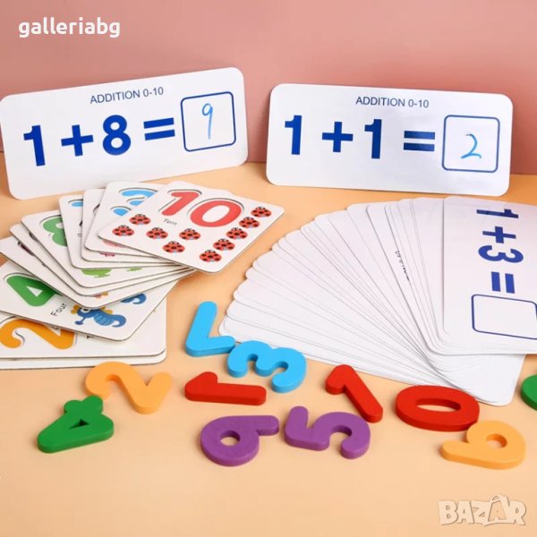 Това е уникално направена игра, с която детето ще учи математика по най-забавния начин! Освен 3D дървените цифри и разноцветните клечки за по-лесно и нагледно броене, играта разполага с карти, на които са нарисувани съответния брой различни животинки и на тях има място да се постави съответната цифра. И още – върху други бели карти са написани лесни задачи по математика – всички варианти за събиране и изваждане на числата от 1 до 10 и празно място, където детето да попълни отговора. В комплекта има и маркер, който лесно се трие. Това е една невероятна игра, която ще запознае и научи детето на основите на математиката по лесен и забавен начин!