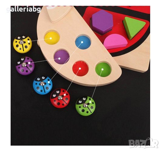 Дървена играчка тип Монтесори с геометрични форми и малки гаргари за риболов. Калинката е със затворени крила, на повърхността им има малки цветни калинки, които могат да се ловят.