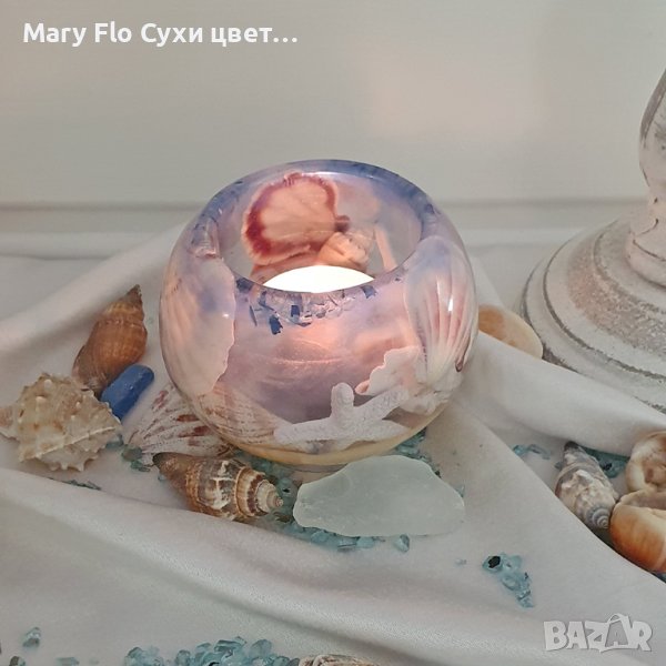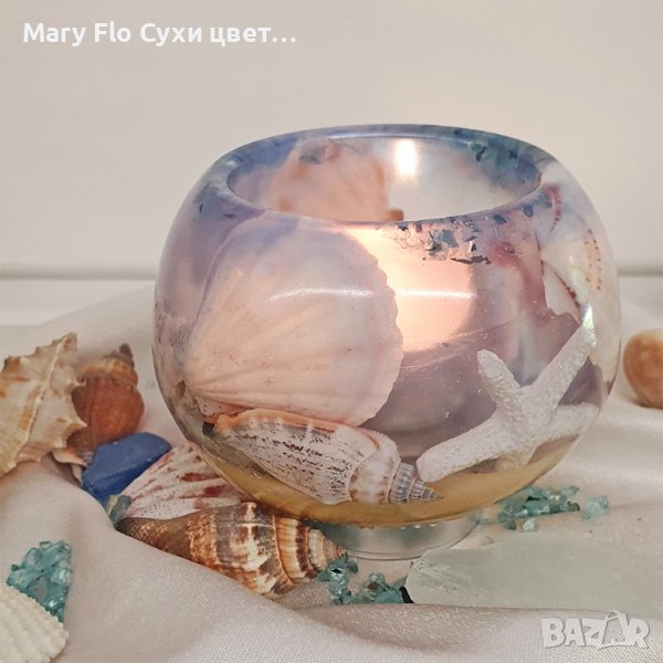 Свещник или кутийка за бижута, изработена от епоксидна смола и украсена с естествени морски миди, раковини и пясък. Този уникален продукт придава морски шарм и елегантност на всяко пространство. Свещникът/кутийката има изразителен дизайн и комбинира красивите текстури и цветове на морските елементи. Уникално и стилно бижу, в което можете да съхранявате своите скъпоценни вещи или просто да се насладите на нежната светлина на свещта. Докоснете красотата на морето във вашето пространство с този изящна свещник или кутийка за бижута. Размери Диаметър 80мм, Височина 50мм. Като комплимент от Mary Flo ще добавим и чаена свещ като Подарък.