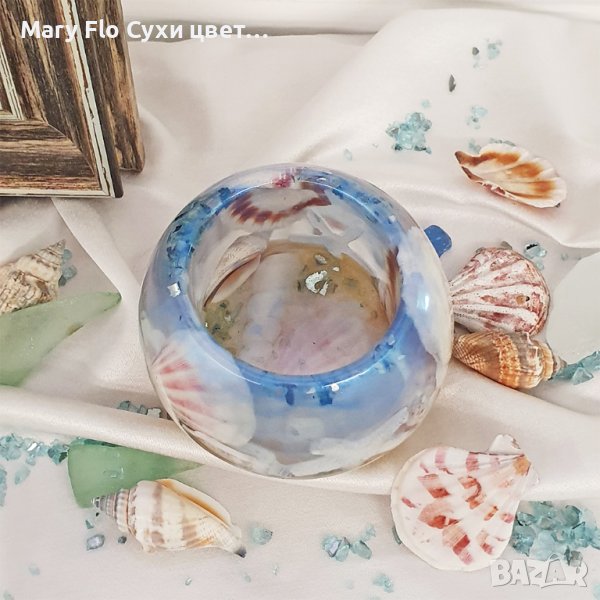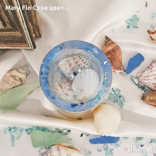 Свещник изработен от епоксидна смола и украсен с естествени морски миди, раковини и пясък. Този уникален продукт придава морски шарм и елегантност на всяко пространство. Свещникът има изразителен дизайн и комбинира красивите текстури и цветове на морските елементи. Уникално и стилно бижу с което да се насладите на нежната светлина на свещта. Докоснете красотата на морето във вашето пространство с този изящна свещник. Размери Диаметър 50мм, Височина 80мм. Като комплимент от Mary Flo ще добавим и чаена свещ като Подарък.