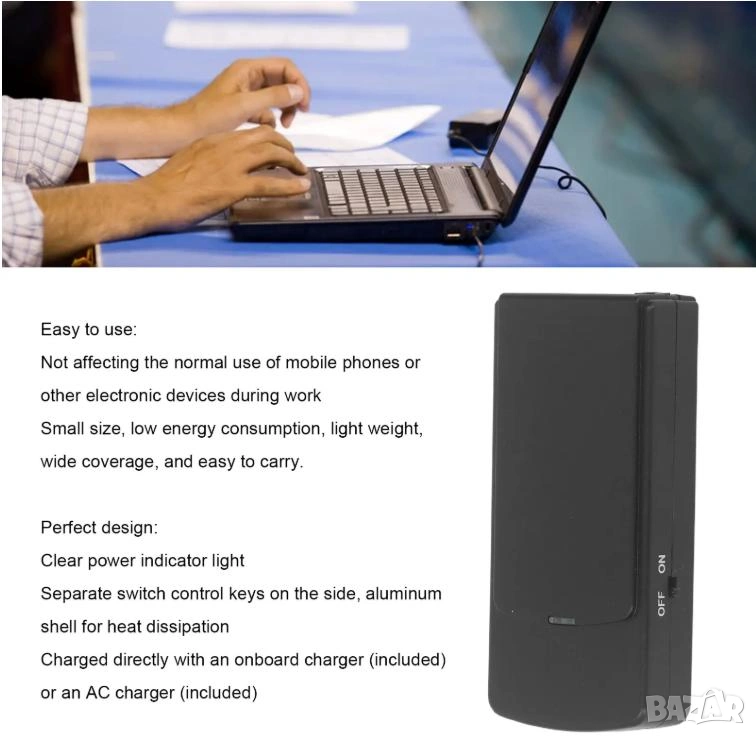 Кратко описание: Това висококачествено устройство за блокиране на заглушаване на сигнала ще се побере в дланта Ви или удобно в джоба Ви. То е по-малко от типичния мобилен телефон. Това устройство ще блокира и заглушава шпионски устройства, работещи на същата честота.