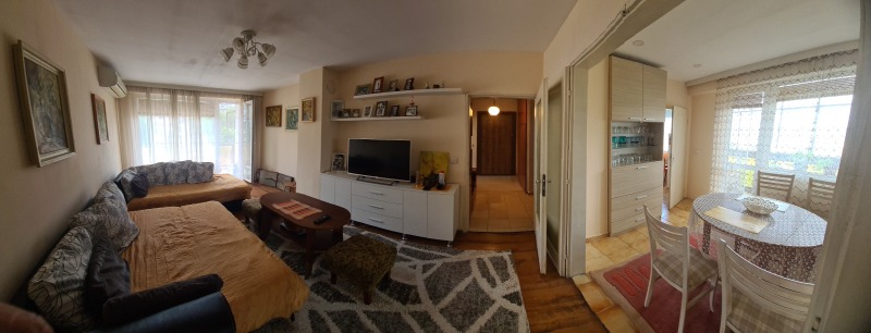 Продава се тристаен разширен апартамент в квартал 'Оборище' със застроена площ от 95 квадратни метра, състоящ се от две спални, хол, кухня, трапезария, баня, тоалетна, коридор и две тераси. Има направен ремонт на апартамента! ПВЦ дограма, ламинат, теракот, фаянс, климатик. Газифициран вход! Продава се с прилежащо избено помещение с площ от 26 квадратни метра.