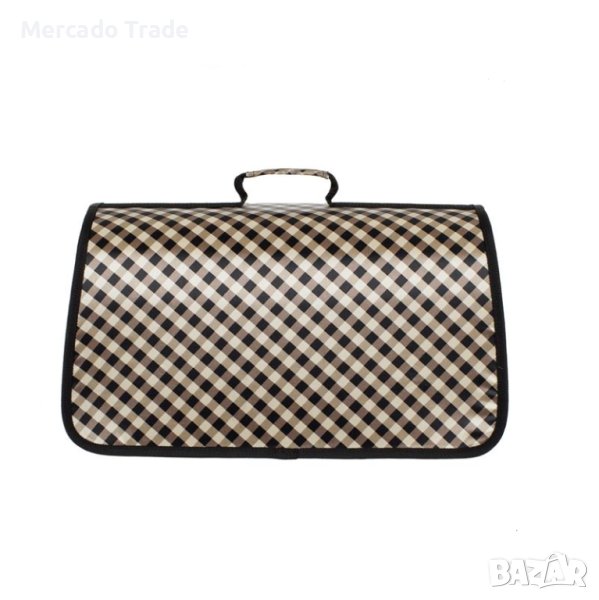 Овална чанта за носене на домашни любимци в бежово черно с шарка на каре, с един вход с метален защитен цип, има дръжка за лесно пренасяне, като е проектирана да има достатъчна вентилация и да поддържа хладно.