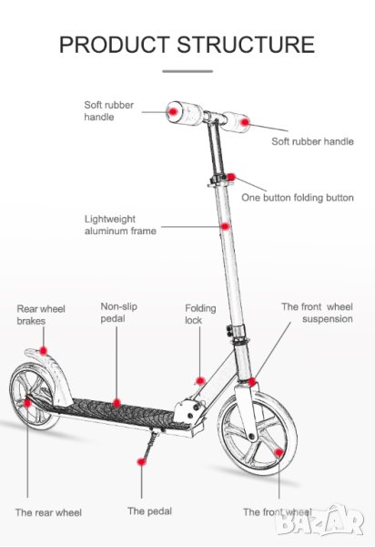 Тротинетка, скутер, Голяма тротинетка с големи гуми, колела 230мм за деца, възрастни, сгъваема 230mm