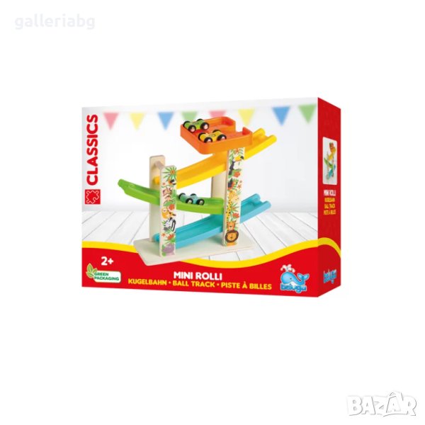 Роллинг писта Mini Rolli от дърво, с 3 търкалящи се писти и 3 търкалящи се предмета, опаковани в цветна кутия.