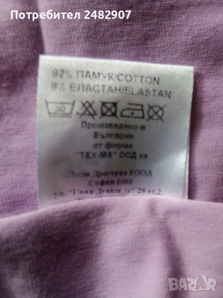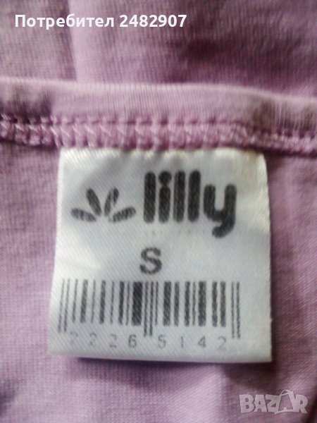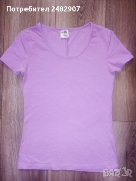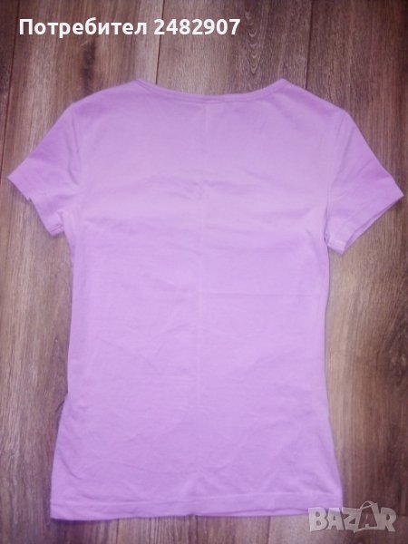 Дамска тениска "Lilly" в бледо лилаво, размер S. Ширина в раменете - 36 см, ширина под мишниците - 37,5 см, дължина от рамото до долу - 58 см, дължина на ръкава от рамото - 13 см. Запазена, със забележка - леко обезцветяване в областта на гърба - видимо от снимките.