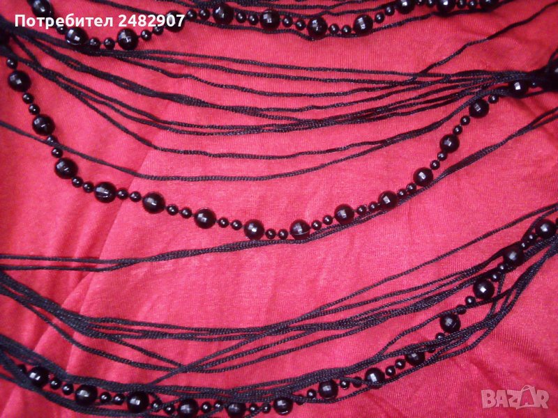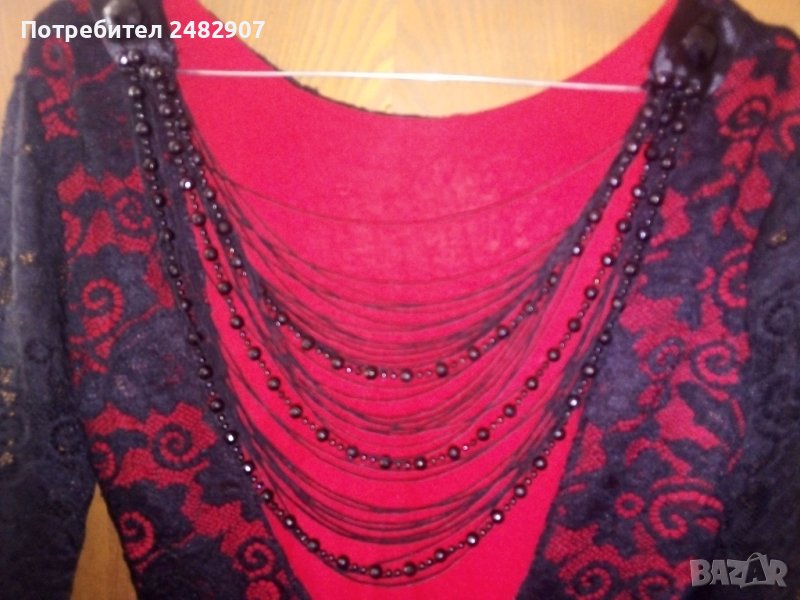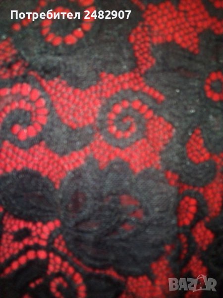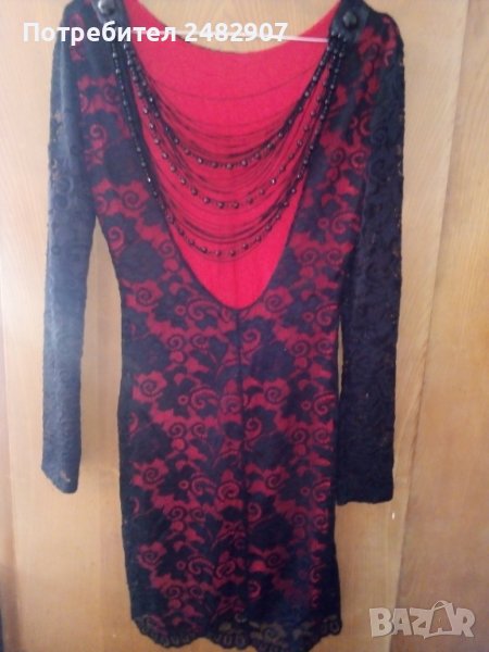 Елегантна дамска рокля с гол гръб, черна еластична дантела и червена подплата с ефектно деколте отзад, размер S. Ширина в раменете - 40 см, ширина под мишниците - 45 см, ширина в долната част - 43 см, дължина от рамото до долу - 87 см, дължина на ръкава от рамото - 60 см. Много запазена, обличана веднъж за повод, отлично състояние, без забележки.