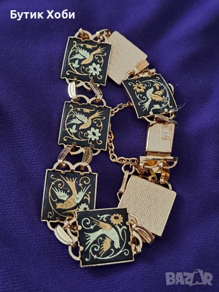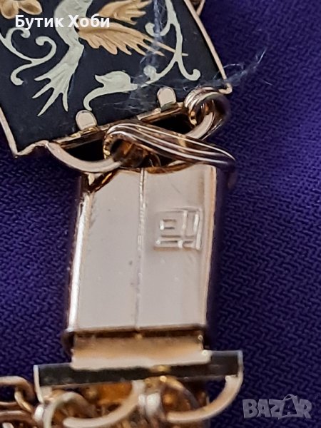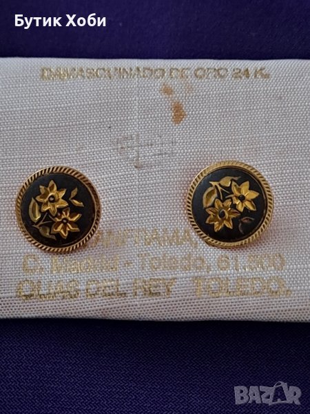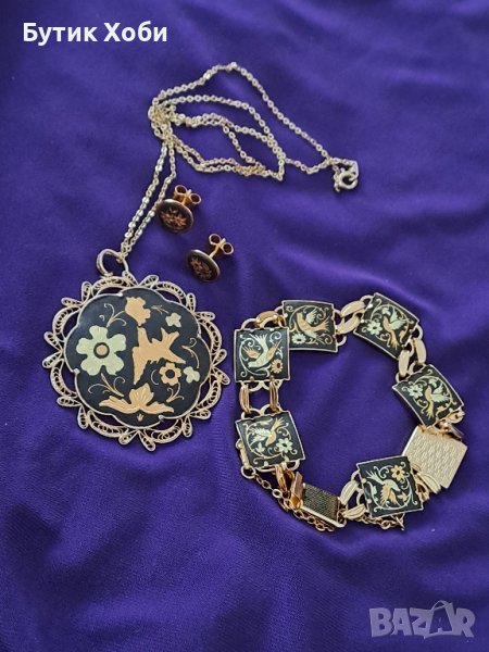 Чудесен комплект бижута Толедо голд - обеци, гривна и колие. Изработени са в техника ,,дамаскин, ,Испания. Оригинален типичен дизайн, филигран, 24 - каратова позлата. В прекрасно състояние са, лека забележка има само по пенданта - изтриване на позлата. Колие: дължина 50 см, пендант - 4,5см; гривна - 20см; обеци - 1см.