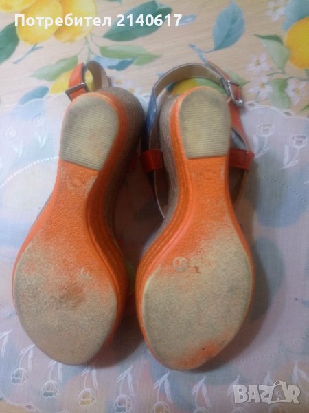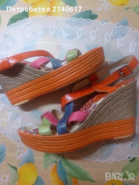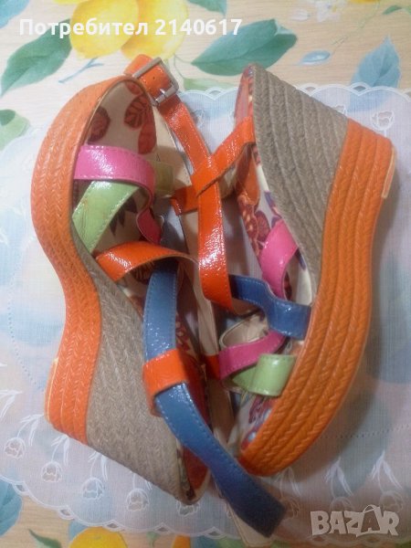 Сандали с многоцветни ленти от естествена кожа с текстилна подплата.Височина на платформата отпред-4см, отзад-10см.ДЪЛЖИНА на стелката вътре -24,6 см = N:38.С преглед и тест.
