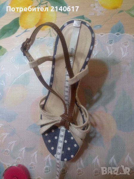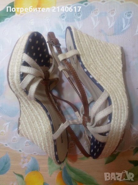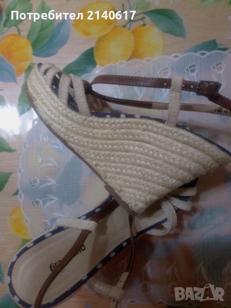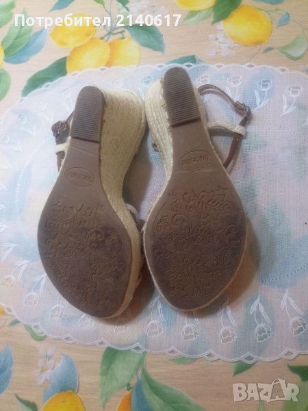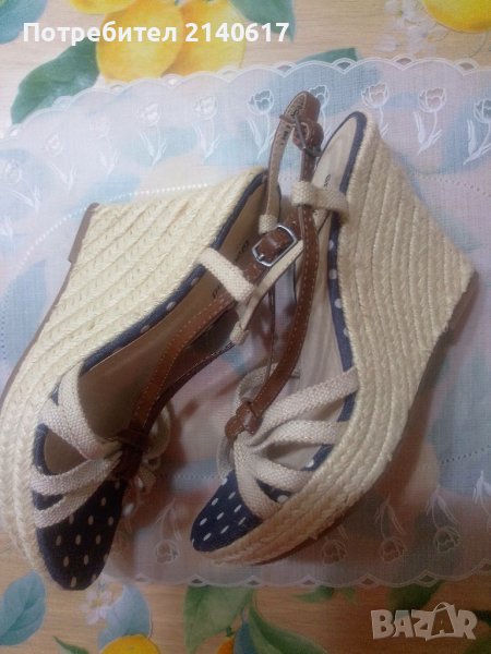 Сандалите са комбинация от текстил(лен,деним) и кожа.платформа-облечена с въже,Височина отпред-3см,отзад-10см.ДЪЛЖИНА на стелката-24см=N:37.С тест и преглед.