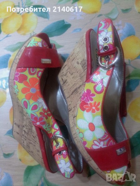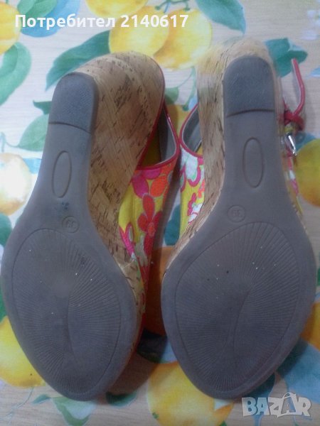 Сандали с коркова платформа,сая-естествена кожа в свежи цветове.Височина отпред -2см, отзад-10см.ДЪЛЖИНА на стелката-25,5см=N39.С преглед.