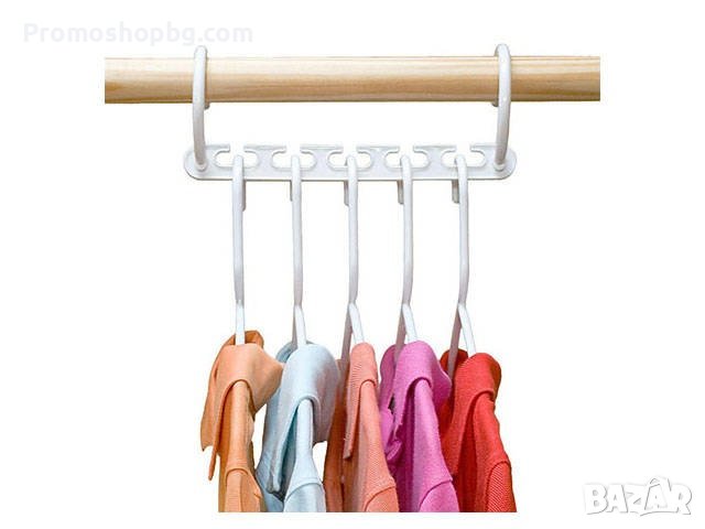 Органайзер закачалки за гардероб . Органайзерът представлява линия с 5 отвора за закачалки + 2 отвора за куки , които се въртят на 360 градуса , Може да се закача вертикално или хоризонтално с 2 отвора за закачалки. Можете да подреждате дрехите си зимни, летни, по цветове и др. Спестява място в гардероба .