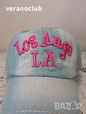 Дамска дънкова шапка с козирка. Декорирана с бродирано лого - LA в красив розов цвят. Шапката отзад е завършена с кожено коланче, чрез което лесно се регулира размерът.
