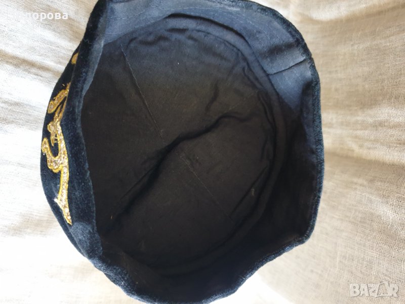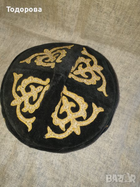 Стара неупотребявана ритуална шапка.Кадифе и златна сърма. Тюбитейка.Обиколка- 102 см.