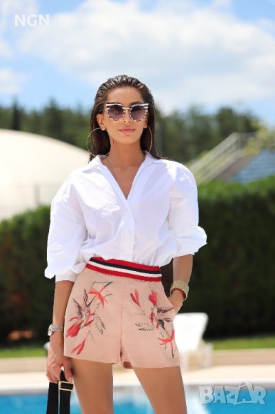 Къси панталонки в нежен цвят пудра от ац. коприна с ефектен ръчно рисуван принт колибри. Панталонките са с джобове и красиво оформен колан от машинно плетиво. Закопчаване със скрит цип. Панталонките са с луксозна изработка – специална изработка без подгъв, която гарантира перфектната линия на Вашата нова модна находка. Висока талия.