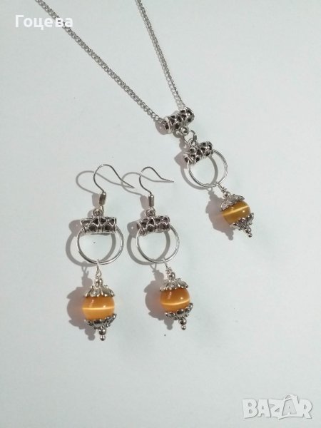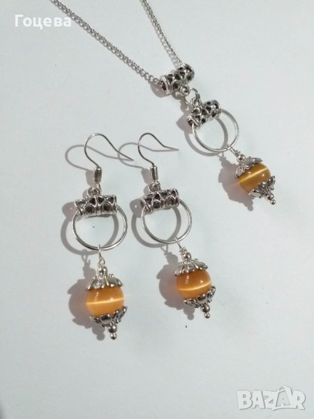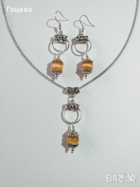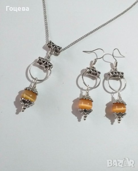 Прекрасният ни нов комплект бижута с оранжеви камъни Котешко око и много красиви орнаменти в цвят сребро Много красиви обици и колие с преливащи камъни Котешко око в нежно оранжево, съчетани с халки и орнаменти в сребърен цвят. Елегантни, стилни, разкошни бижута! Авторски дизайн. Ръчна изработка. Цена на комплекта - 35 лв. За поръчка на лично съобщение. Бърза доставка до всяка точка на България.