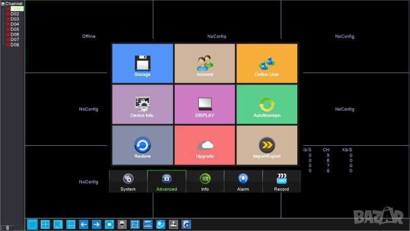 Ресурси на системата: Едновременно многоканално записване в реално време, Възпроизвеждане, Работа в мрежа, USB архивиране