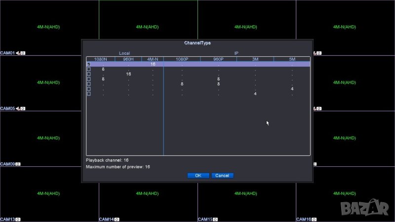 Възпроизвеждане: 16CH 4M-N (8FPS / CH) Запис & 16CH 4M-N (8FPS / CH) Преглед