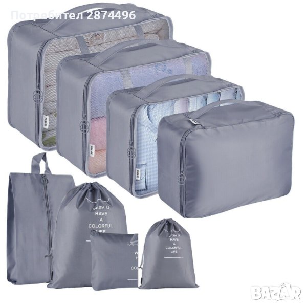 Всички чанти се отварят и затварят с цип. Триете по-големи чанти са с капак от мрежа и дръжка и са идеални за съхраняване на дрехи, тъй като през капака може да виждате какво има вътре. Трите по-малки чанти са изработени от водоустойчиви материали и са перфектно решение за обувки, пране, козметика и други аксесоари и принадлежности.