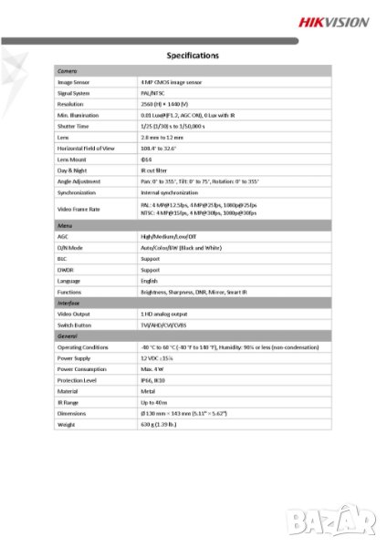 HikVision HWT-B340-VF 4MP 2560x1440@25fps 2.8~12mm Варифокал 108.4° IR 40 Метра IP66 Водоустойчивост
