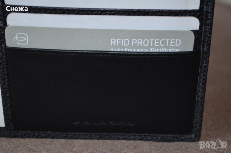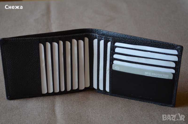 на допир. Целият портфейл е обшит с единичен шев. В портфейла има допълнително поставен материал за RFID защита,