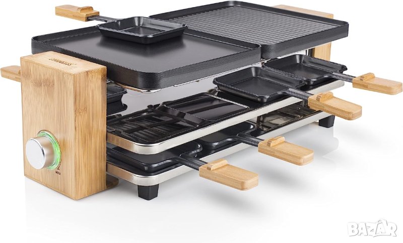 “Раклет” е швейцарски традиционен начин на готвене , който позволява на семействата и приятелите да се насладят на уютна вечеря заедно на една маса. Вече няма да прекарвате часове в кухнята. Всеки може да си приготви любимата храна, докато стоите заедно на масата. Най-горната скара на раклета е изработена от висококачествен лят алуминий и е разделена на две реверсивни плочи с плоска и оребрена страна. От оребрената страна можете да печете с перфектни грил ивици. От плоската страна можете да приготвите храна в друг стил. Комплектите са завършени с 8 тигана, които можете да използвате за готвене на яйца, палачинки или топене на сирене.