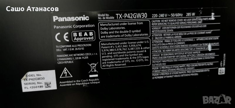 Panasonic TX-P42GW30 с 6 месеца гаранция ,TNPH0937 1 A ,PSC10351H M PKG1 ,TNPA5457 1 SN ,TNPA5358 1