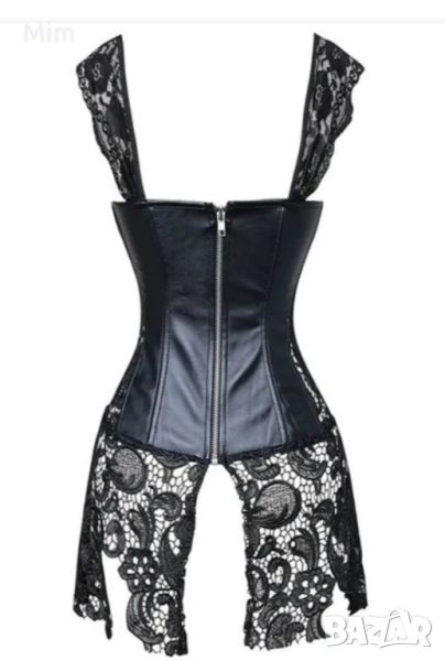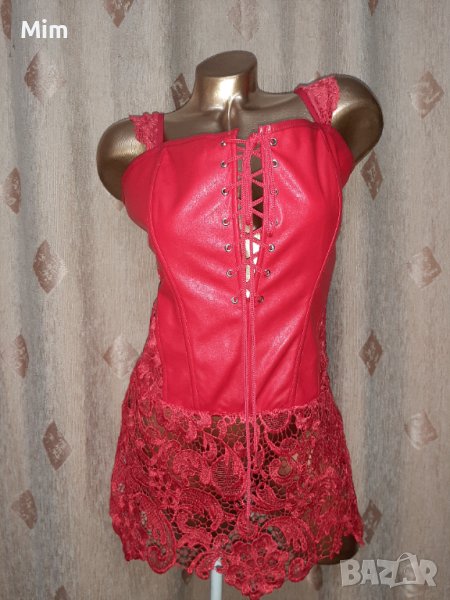 Червена рокля корсет от еко кожа и рязана дантела, отзад закопчаването е по цялата дължина с цип . Бюст 105 см като отпред е с шнур и капси за регулиране на размера по бюста ,ханш 100 см ,дължина от подмишници 54 см .Цената е за бройка, Нови без хартиен носител.
