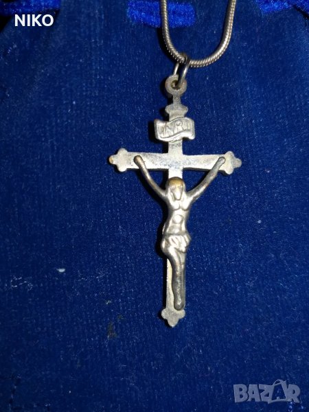 Старинен сребърен кръст с Исус - разпятие Христово с 2/два/синджира,