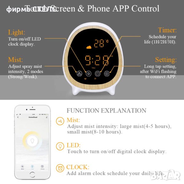 етерични масла и овлажнител, но също така и будилник, функция за интелигентно