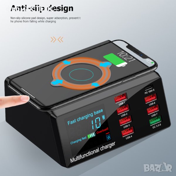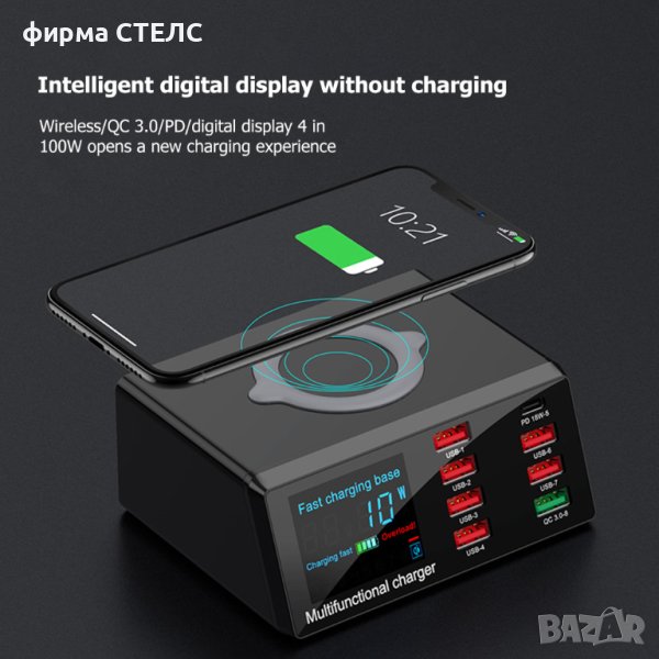 Станция за зареждане STELS X9, Безжично зареждане, USB 8бр, 100W