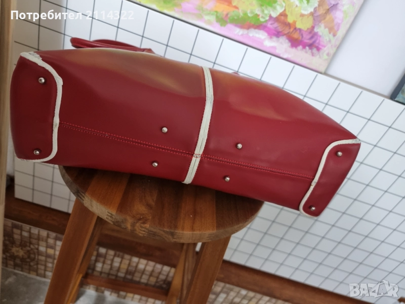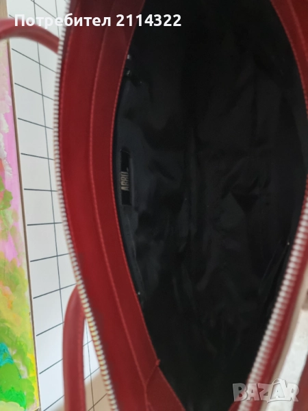 Abro кожена чанта, италианска. Червена с бял акцент. Вътре има едно голямо отделение, джоб за телефон и малък джоб с цип.