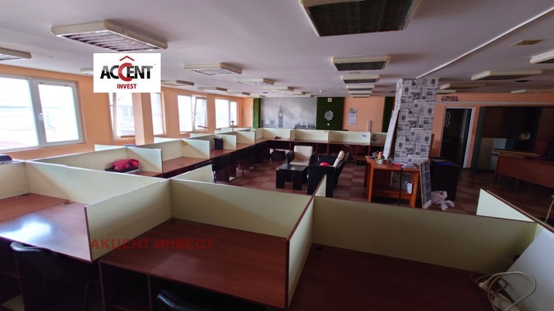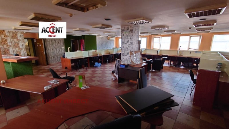 КОД 20765 'Акцент Инвест' Ви предлага офис под наем в района на Жп гара. Имотът е с площ от 150 кв.м. и се намира на 6-ти етаж в бизнес сграда. Състои се от едно голямо работно помещение, два санитарни възела, едно по-малко работно помещение. Предлага се с обзавеждането от снимките, има нужда от освежаване. Посочената цена е без включен ДДС. Такса поддръжка се заплаща отделно спрямо броя на ползвателите.