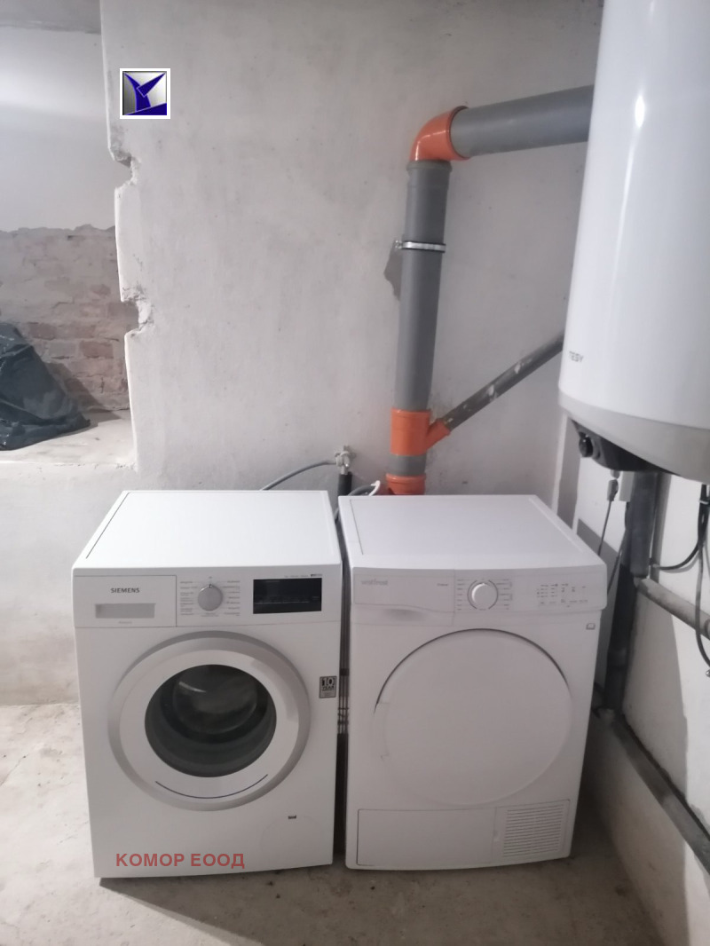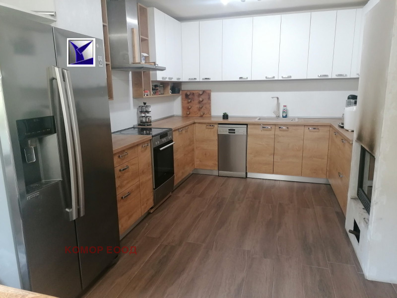 1-ви етаж - кухня с трапезария 20кв.м., самостоятелна спалня 12кв.м., втора самостоятелна спалня 15кв.м., маза 20кв.м., пригодена като перално помещение (пералня и сушилня), баня и тоалетна 2,5кв.м. Отоплението е решено с камина с вентилационнин отвори с топъл въздух във всички стаи.