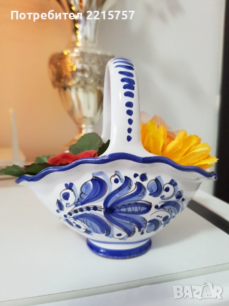 1)Бонбониера, керамика. Ръчно рисувана от Италия. Вис.23см, шир. 14см, овал късата част 13см. Цена 30лв..................................................................................................................2)Поставка за еднократни чаши. Вис.18см, Ф 9см. Ръчно рисувана . Италия. Цена 20лв...................................................................................................................3)Посребрена Амфорка винтадж с натурален Оникс. Италия. Цена 42лв....................................................................................................................4)Порцеланова обувка Рр. 13/7см. С маркировка. Цена 18лв....................................................................................................................5)Декоративна кошничка, ръчно рисувана. Италия. Вис.11,5с, дъл.13см. Цена 15лв.