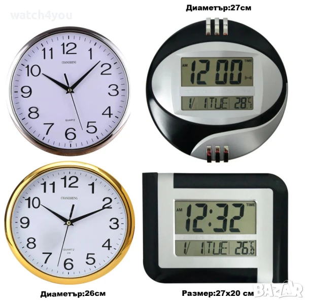 2.Стенен аналогов часовник със стрелки и плавен (безшумен) механизъм. Диаметър:26см и 30см.
