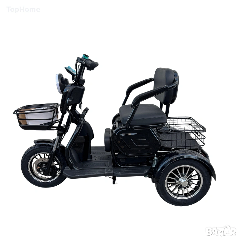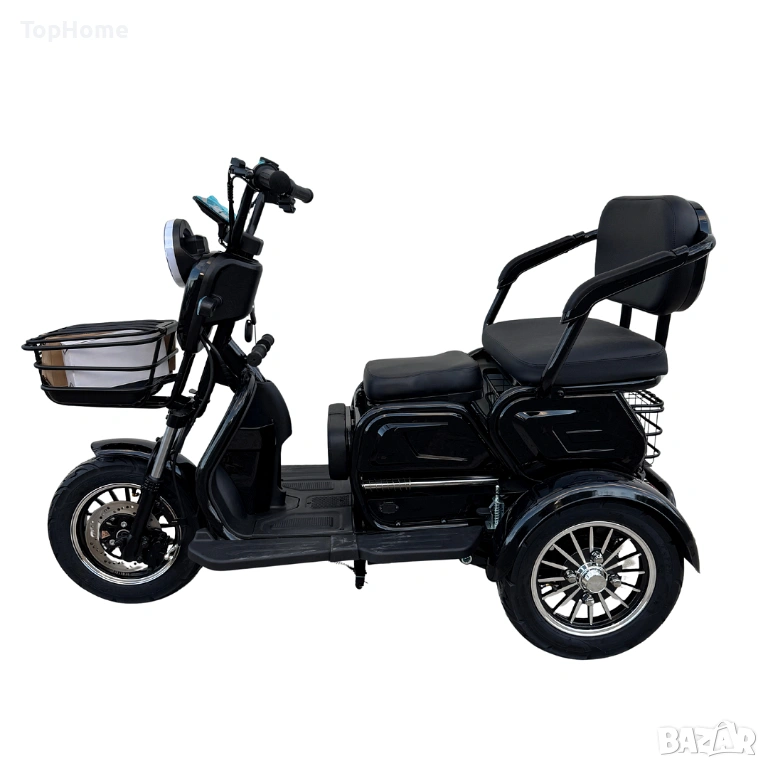Триколката е с дигитално табло, три нива на скоростта, стопове, мигачи и габарити, LED фар. Предна и задна ръчни спирачки. Голям кош за багаж. Триколката е с вградена втора седалка за допълнителен пасажер, като самата седалка се движи във височина, което създава удобство за нисък или висок човек. Подарък - 2 бр. огледала за задно виждане + 2бр. дистанционни с аларма и безконтактно включване + задна пазарска кошница за пазаруване.